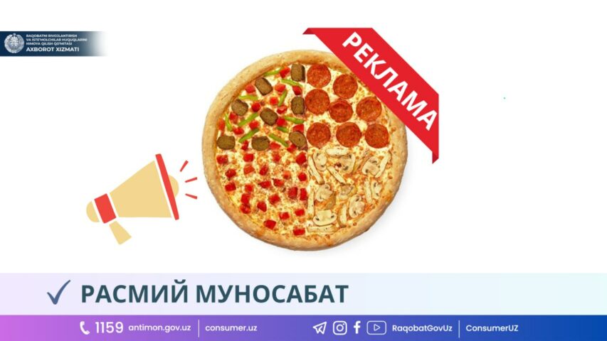 Рақобатни ривожлантириш ва истеъмолчилар ҳуқуқларини ҳимоя қилиш қўмитаси https://t.me/SukutSaqlama каналида “Bellissimo Pizza” фаолиятига оид реклама лавҳаси юзасидан билдирилган эътирозлар юзасидан қуйидагиларни маълум қилади. Ўзбекистон Республикаси “Реклама тўғрисида”ги Қонунининг 16-моддасига мувофиқ, рекламада – жинси, ирқи, миллати, тили, дини, ижтимоий келиб чиқиши, эътиқоди, шахсий ва ижтимоий мавқейига қараб, бошқа ҳолатларга кўра камситиш ёки ўзга шахсларнинг товарларини бадном қилиш;…
