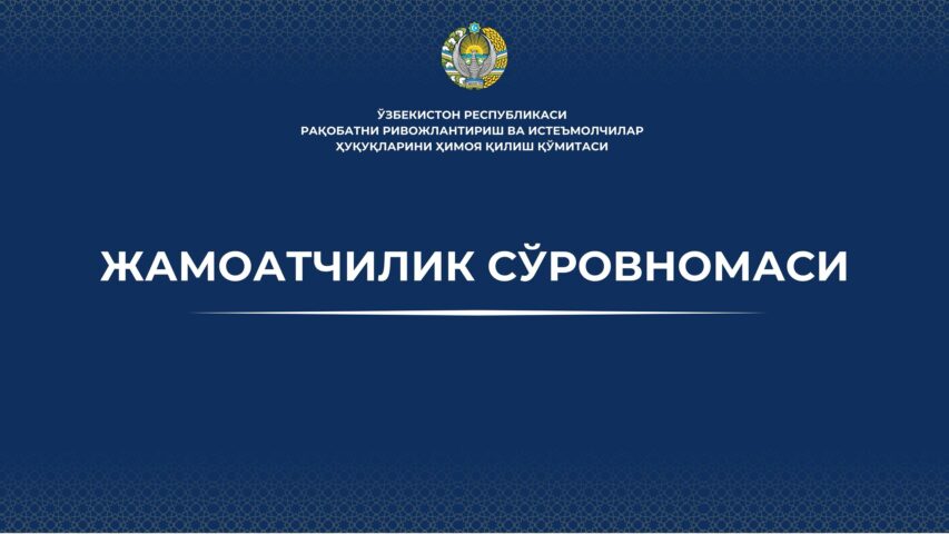 Ўзбекистон Республикаси Рақобатни ривожлантириш ва истеъмолчилар ҳуқуқларини ҳимоя қилиш қўмитаси томонидан «Мобил алоқа хизматларини қандай баҳолайсиз?» мавзусида истеъмолчилар фикрини ўрганиш мақсадида жамоатчилик сўровномаси ўтказилмоқда. Сўровнома натижаларидан истеъмолчилар ҳуқуқларини ҳимоя қилиш ҳамда хизматлар сифатига оид таклифларни ишлаб чиқишда фойдаланилади. Сўровномада иштирок этиш учун ҳавола: https://forms.gle/LyTKcrLm1mwFfUjTA Сўровнома 1 декабрга қадар давом этади.
