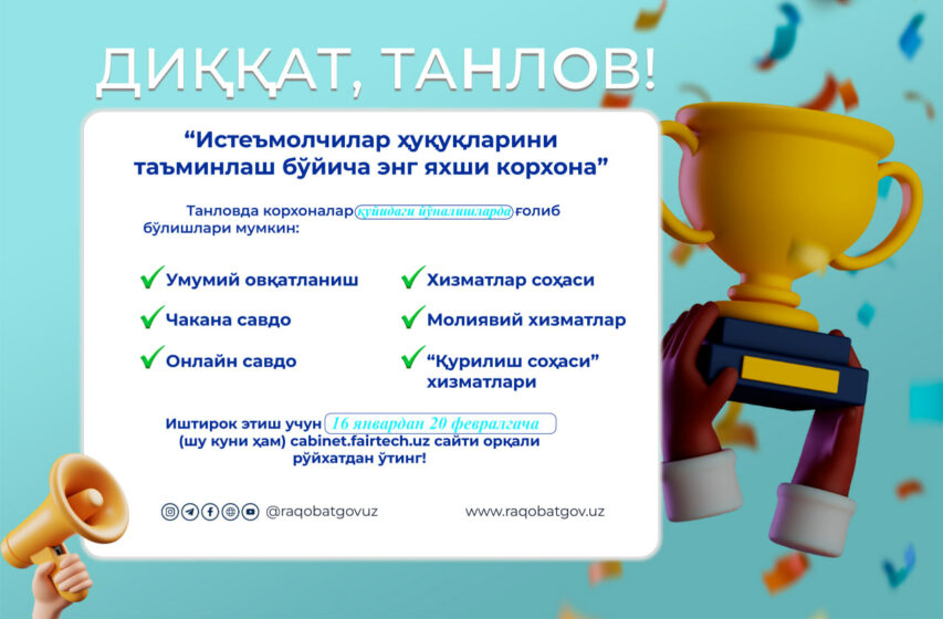 “15 март – Бутунжаҳон истеъмолчилар ҳуқуқлари куни” муносабати билан Ўзбекистон Республикаси Рақобатни ривожлантириш ва истеъмолчилар ҳуқуқларини ҳимоя қилиш қўмитаси томонидан “Истеъмолчилар ҳуқуқларини таъминлаш бўйича энг яхши корхона”ни аниқлаш учун танлов ўтказилади. Танлов натижасида ғолиб корхоналар Қўмитанинг “Истеъмолчи ишончи” сифат белгиси билан тақдирланади. Танлов “Умумий овқатланиш”, “Чакана савдо”, “Онлайн савдо”, “Молиявий хизматлар” “Хизматлар соҳаси” ва “Қурилиш…