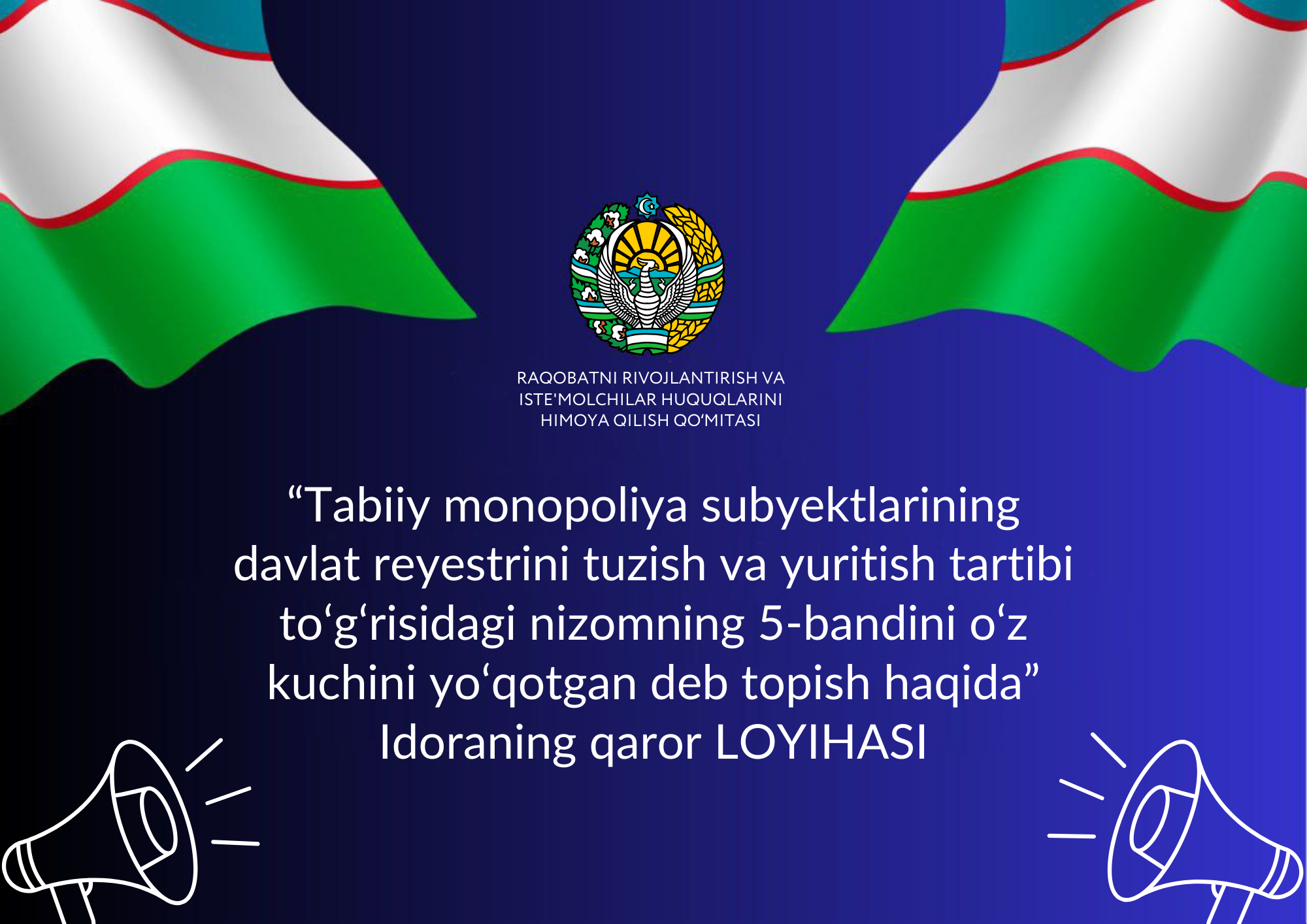 Ўзбекистон Республикаси Рақобатни ривожлантириш ва истеъмолчилар ҳуқуқларини ҳимоя қилиш қўмитаси “Табиий монополия субъектларининг давлат реестрини тузиш ва юритиш тартиби тўғрисидаги низомнинг 5-бандини ўз кучини йўқотган деб топиш ҳақида” Идоранинг қарорлойиҳаси норматив-ҳуқуқий ҳужжатлар лойиҳалари муҳокамаси портали (https://regulation.gov.uz/oz/d/85462)га жойлаштирилганлигини маълум қилади.