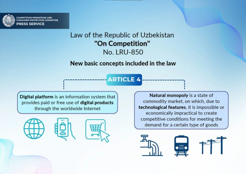 NEW LAW OF THE REPUBLIC OF UZBEKISTAN “ON COMPETITION” No. LRU-850 NewsBy Raqobat qo'mitasi13.07.2023New basic concepts included in the law: Digital platform Natural monopoly