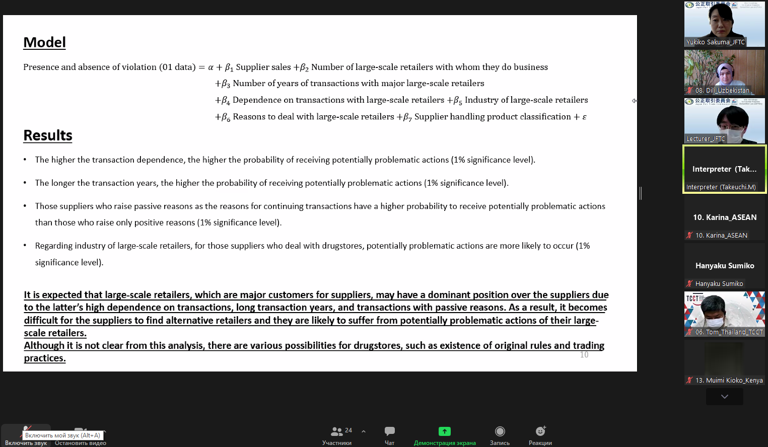 In this program, government agencies whose activities are directly related to competition policy were invited. Representatives from a number of countries, including the Philippines, Malaysia, Mongolia, Indonesia, Thailand, Kenya, Ukraine, Nigeria, and Angola, were also present. At the end of the program, representatives of all participating countries made presentations on the application of knowledge and experience for the development of the country and future areas of cooperation.