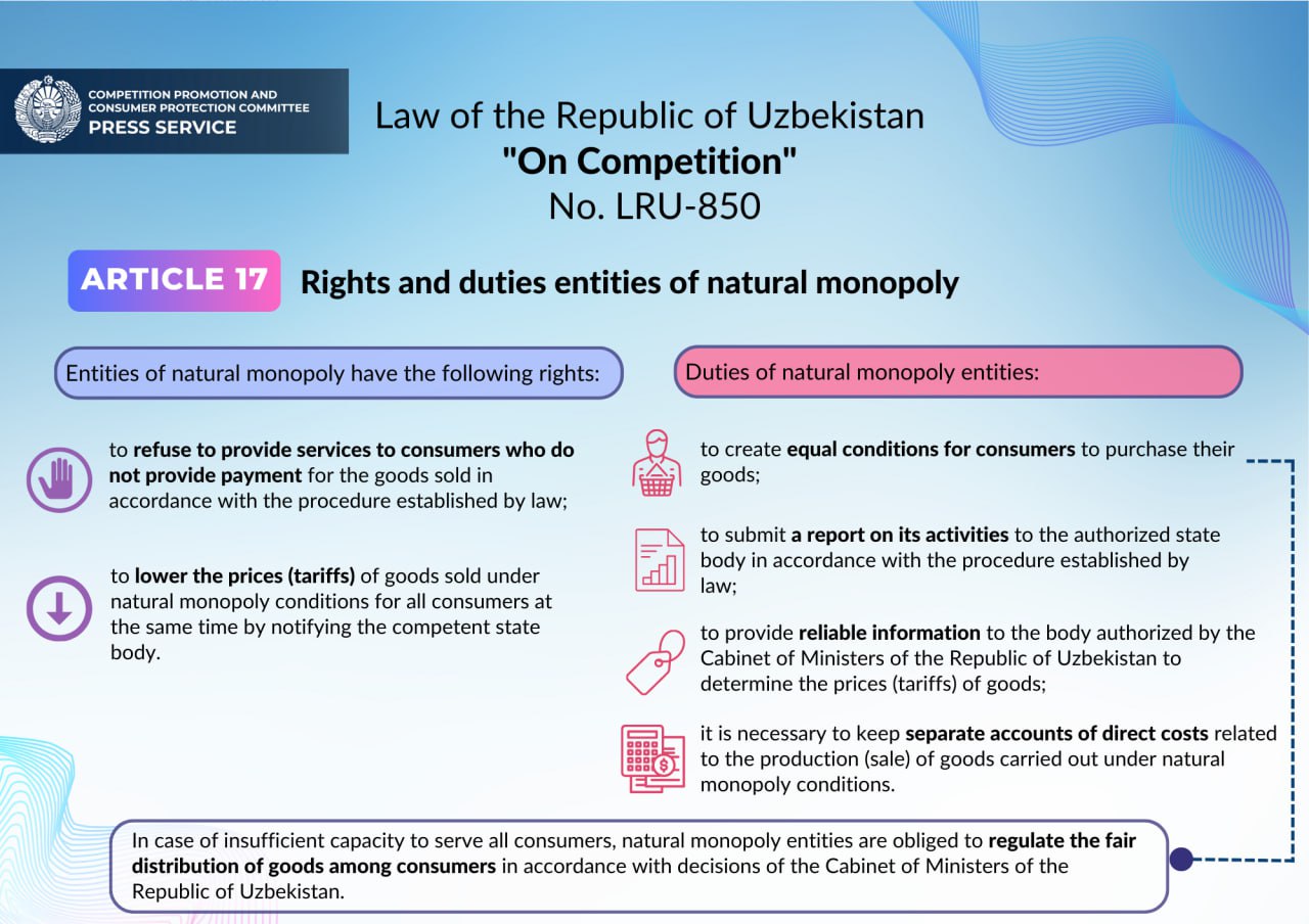 Jul142023Article 17. Rights and duties entities of natural monopoly Share this post Share on FacebookShare on Facebook TweetShare on Twitter Pin itShare on Pinterest Share on WhatsAppShare on WhatsApp Share on LinkedInShare on LinkedIn Other newsAddress by the President of the Republic of Uzbekistan Shavkat Mirziyoyev at the opening ceremony of the 43rd session of the UNESCO General Conference30.10.2025The opening ceremony of the 43rd session of the UNESCO General Conference will soon begin at the Samarkand Congress Center30.10.2025On October 22, 2025, within the framework of the Institutional Capacity Building Project implemented in cooperation…24.10.2025In the city of Brest, Republic of Belarus, within the framework of the 59th Meeting of the Interstate Council for Antimonopoly Policy (ICAP)…24.10.2025From October 20 to 23, 2025, the city of Brest, Republic of Belarus…22.10.2025Meeting Held in Belarus to Strengthen Cooperation in the Field of Consumer Protection21.10.2025