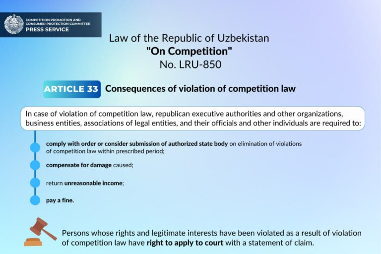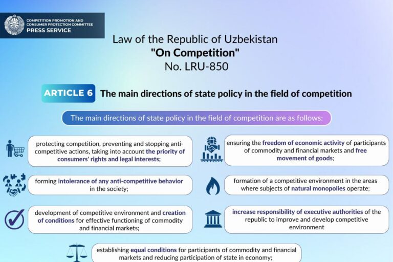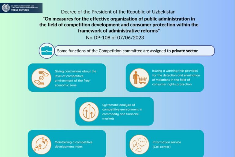 Aug32023 The Decree of the President of the Republic of Uzbekistan No. UP-108 dated July 6, 2023 “On measures for the effective organization of public administration in the field of competition development and consumer protection within the framework of administrative reform”.