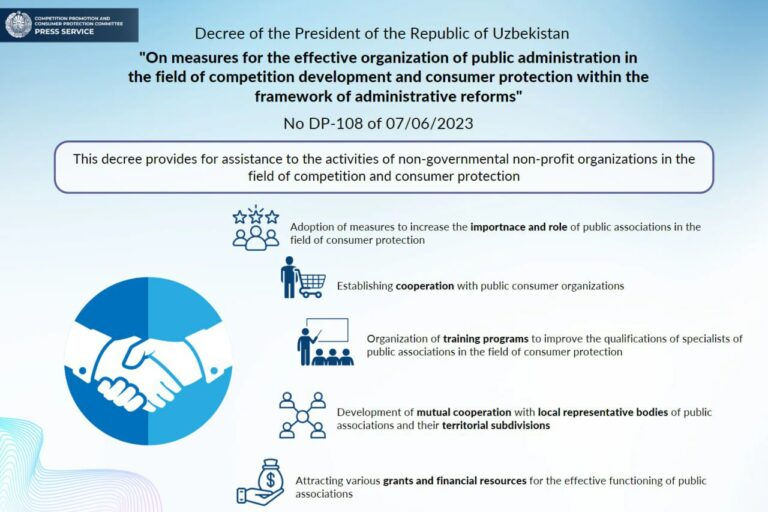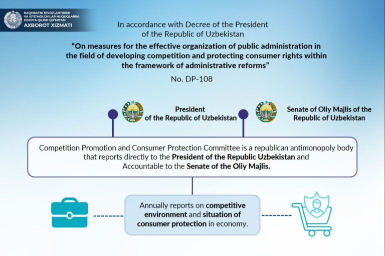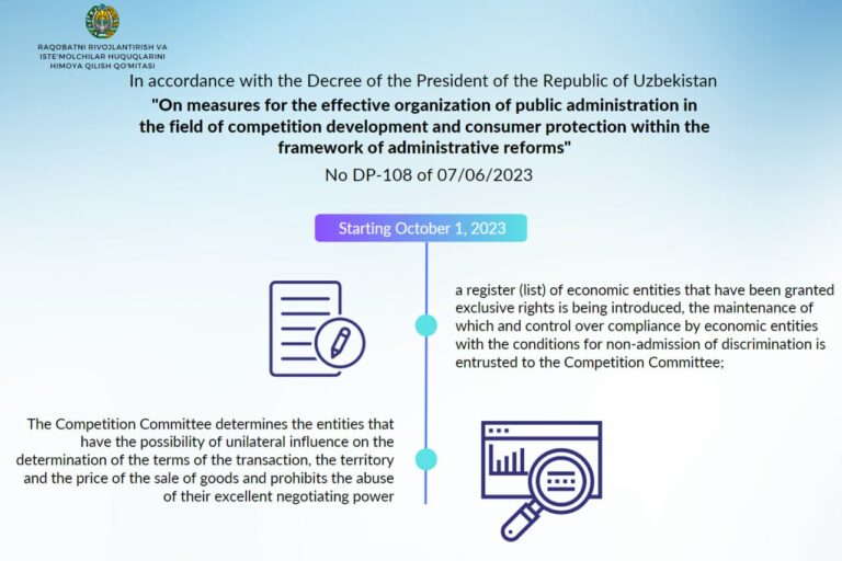 Jul222023 Recently Decree of the President of the Republic of Uzbekistan No. UP-108 dated July 6, 2023 “On measures for the effective organization of public administration in the field of competition development and consumer protection within the framework of administrative reform” was adopted.