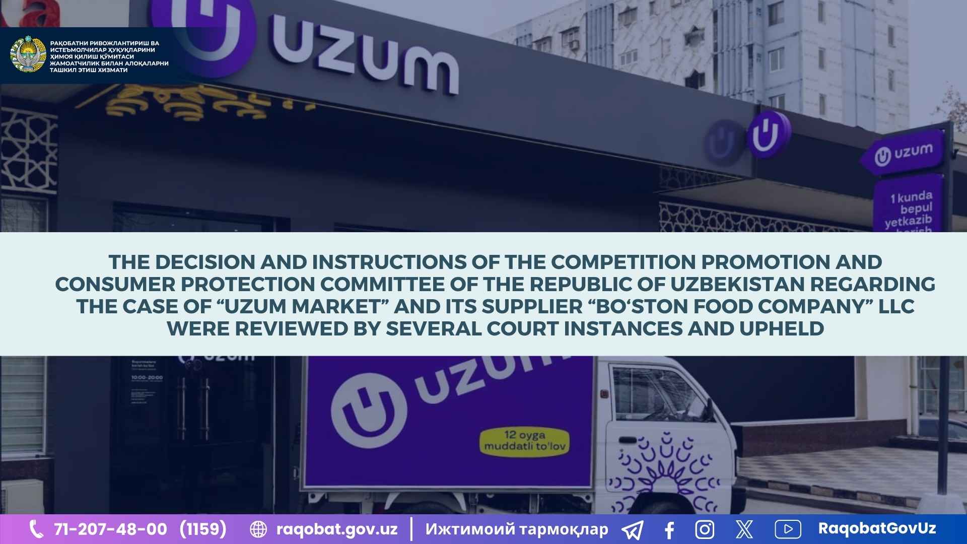 On this basis, the Special Commission of the Committee initiated a case in accordance with the established procedure. Upon reviewing the case, it was determined that “UZUM MARKET” LLC and “BO‘STON FOOD COMPANY” LLC had violated Article 6 of the Law “On Protection of Consumer Rights.” To remedy the violations, the enterprises were instructed as follows: