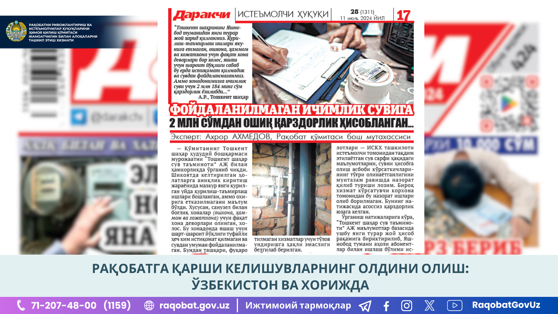 Ўзбекистон Республикаси Вазирлар Маҳкамасининг 194-сон қарори билан берилган “Истеъмолчиларга сув таъминоти ва оқова сувни чиқариш хизматлари кўрсатиш Қоидасига асосан, ичимлик сув таъминоти ва оқова сувни чиқариш марказлаштирилган тизимларидан фойдаланиш соҳасида сув қувурлари — канализация хўжалиги ташкилотлари — ИСКХ ташкилоти истеъмолчи томонидан тақдим этилаётган сув сарфи ҳақидаги маълумотларни, сувни ҳисобга олиш асбоби кўрсаткичларининг тўғри олинаётганлигини мунтазам равишда назорат қилиб туриши лозим. Бироқ хизмат кўрсатувчи корхона томонидан бу назорат ишлари олиб борилмаган. Бунинг натижасида асоссиз қарздорлик юзага келган.