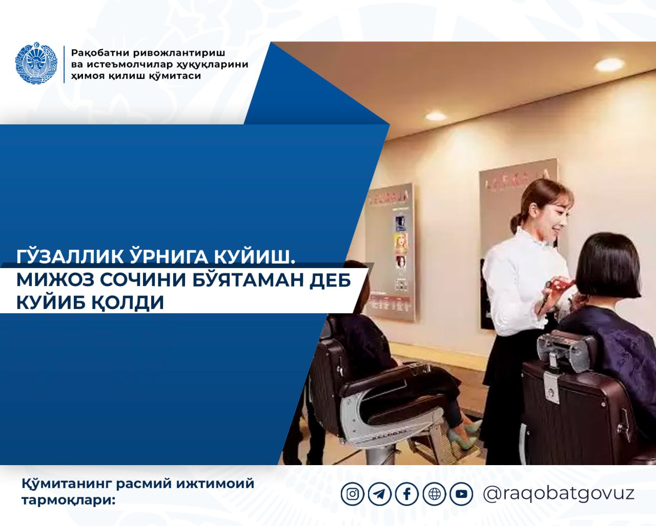 Жумладан, Тошкентдаги “BEAUTY ZOHAB” гўзаллик салони ходимининг масъулиятсизлиги фуқарога ташвиш келтирган. Фуқаронинг сочини бўяш жараёнида бошнинг тери қисми куйиб кетгани ҳақидаги эътирозли мурожаат Рақобат қўмитасига келиб тушган.