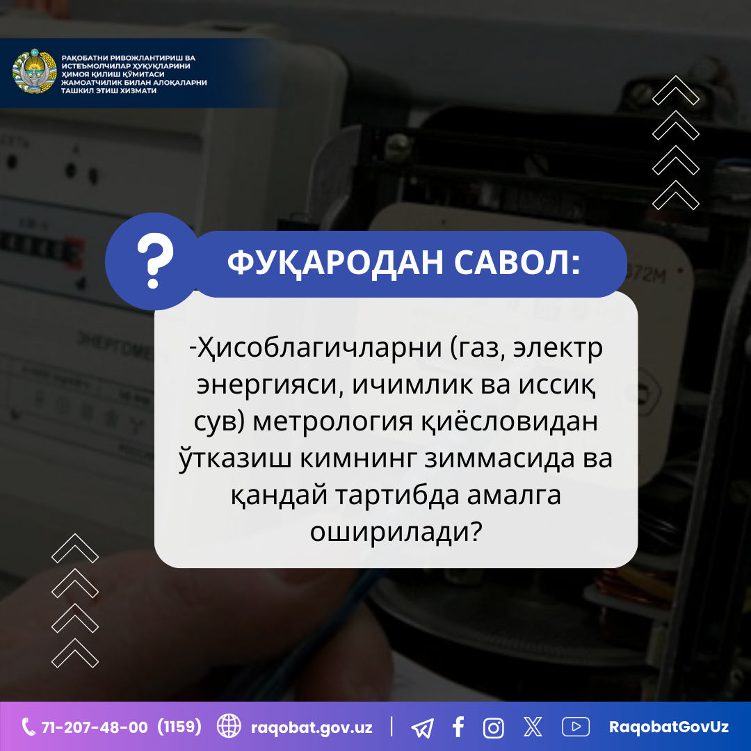 Ҳисоблагичларни (газ, электр энергияси, ичимлик ва иссиқ сув) метрология қиёсловидан ўтказиш кимнинг зиммасида ва қандай тартибда амалга оширилади?