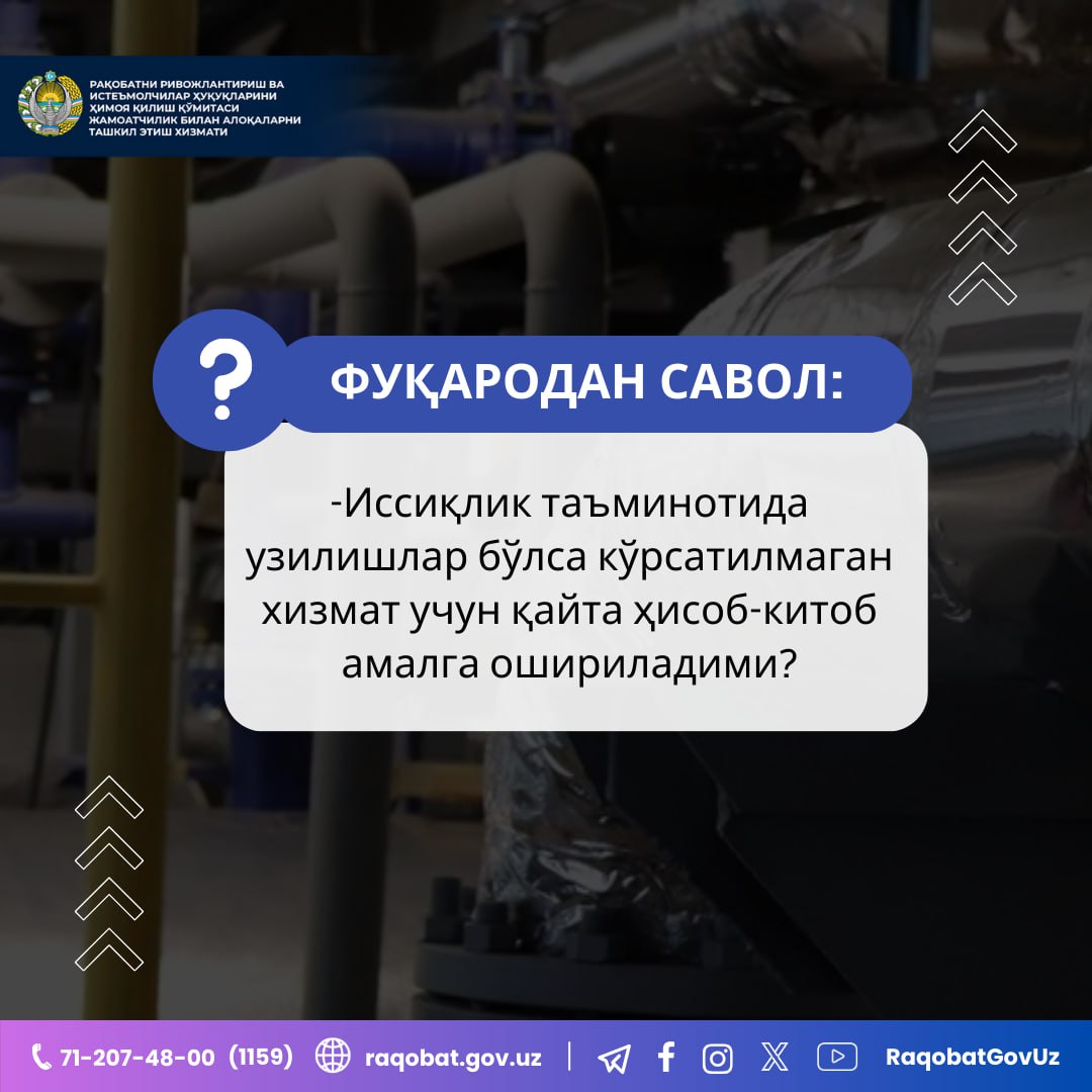Иссиқлик таъминотида узилишлар бўлса кўрсатилмаган хизмат учун қайта ҳисоб-китоб амалга ошириладими?