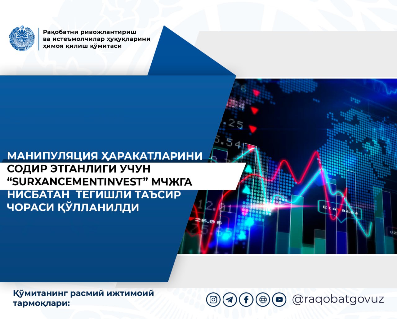 МАНИПУЛЯЦИЯ ҲАРАКАТЛАРИНИ СОДИР ЭТГАНЛИГИ УЧУН “SURXANCEMENTINVEST” МЧЖга НИСБАТАН ТЕГИШЛИ ТАЪСИР ЧОРАСИ ҚЎЛЛАНИЛДИ