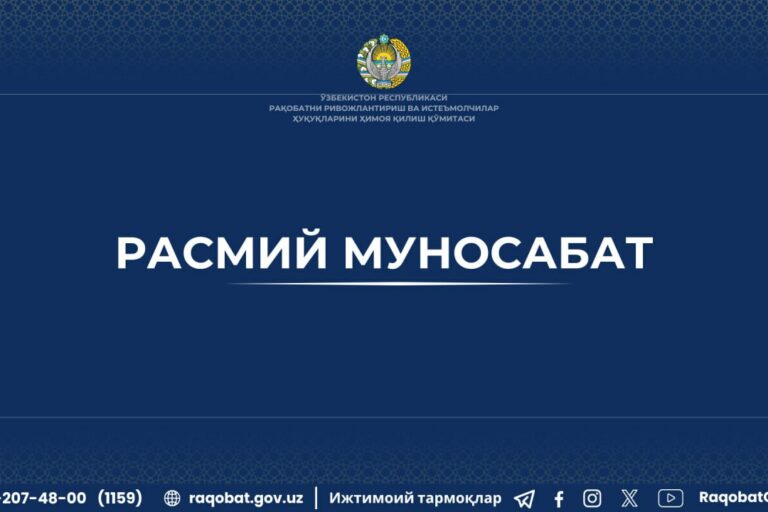 Янв202026 Биржа савдоларини ўтказишда рақобат тўғрисидаги қонунчилик талабларини бузгани учун “Namangan to‘qimachi cluster” МЧЖга нисбатан тегишли таъсир чораси қўлланилди