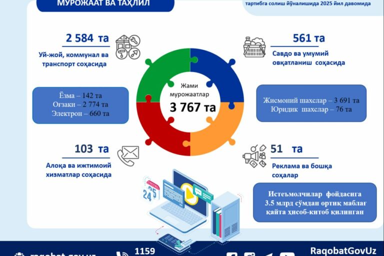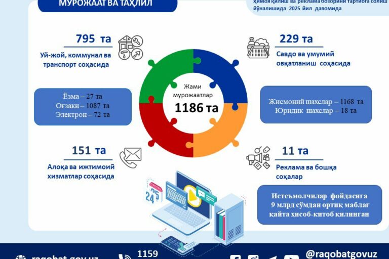 Янв162026 Қорақалпоғистон Республикаси Рақобатни ривожлантириш ва истеъмолчилар ҳуқуқларини ҳимоя қилиш қўмитасига ўтган 2025 йил давомида истеъмолчилардан жами 1 385 та мурожаатлар келиб тушган