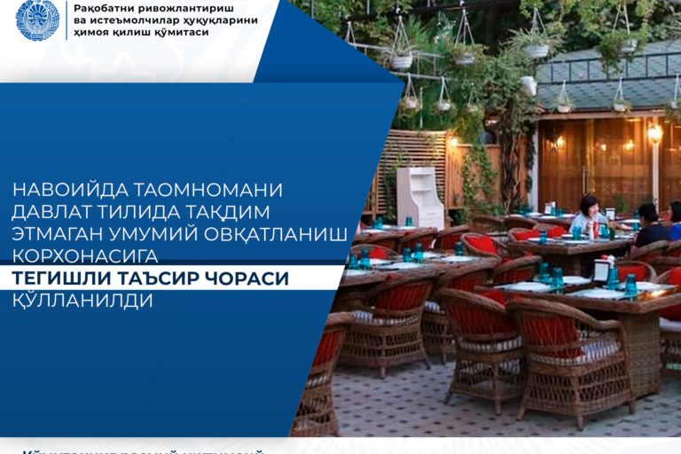 Март112025 НАВОИЙДА ТАОМНОМАНИ ДАВЛАТ ТИЛИДА ТАҚДИМ ЭТМАГАН УМУМИЙ ОВҚАТЛАНИШ КОРХОНАСИГА ТЕГИШЛИ ТАЪСИР ЧОРАСИ ҚЎЛЛАНИЛДИ