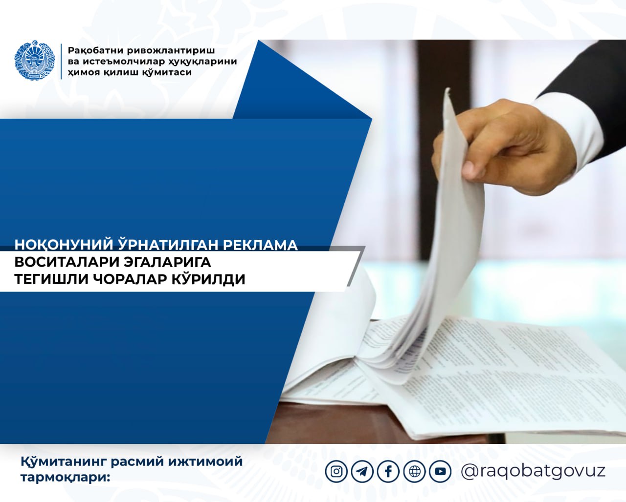 Рақобат қўмитаси Ўзбекистон Республикаси “Реклама тўғрисида”ги Қонунига биноан рекламанинг айланиши соҳасидаги ваколатли давлат органи сифатида қонунбузилиш ҳолатларини аниқлаб, уларга таъсир чоралари кўриб бормоқда.