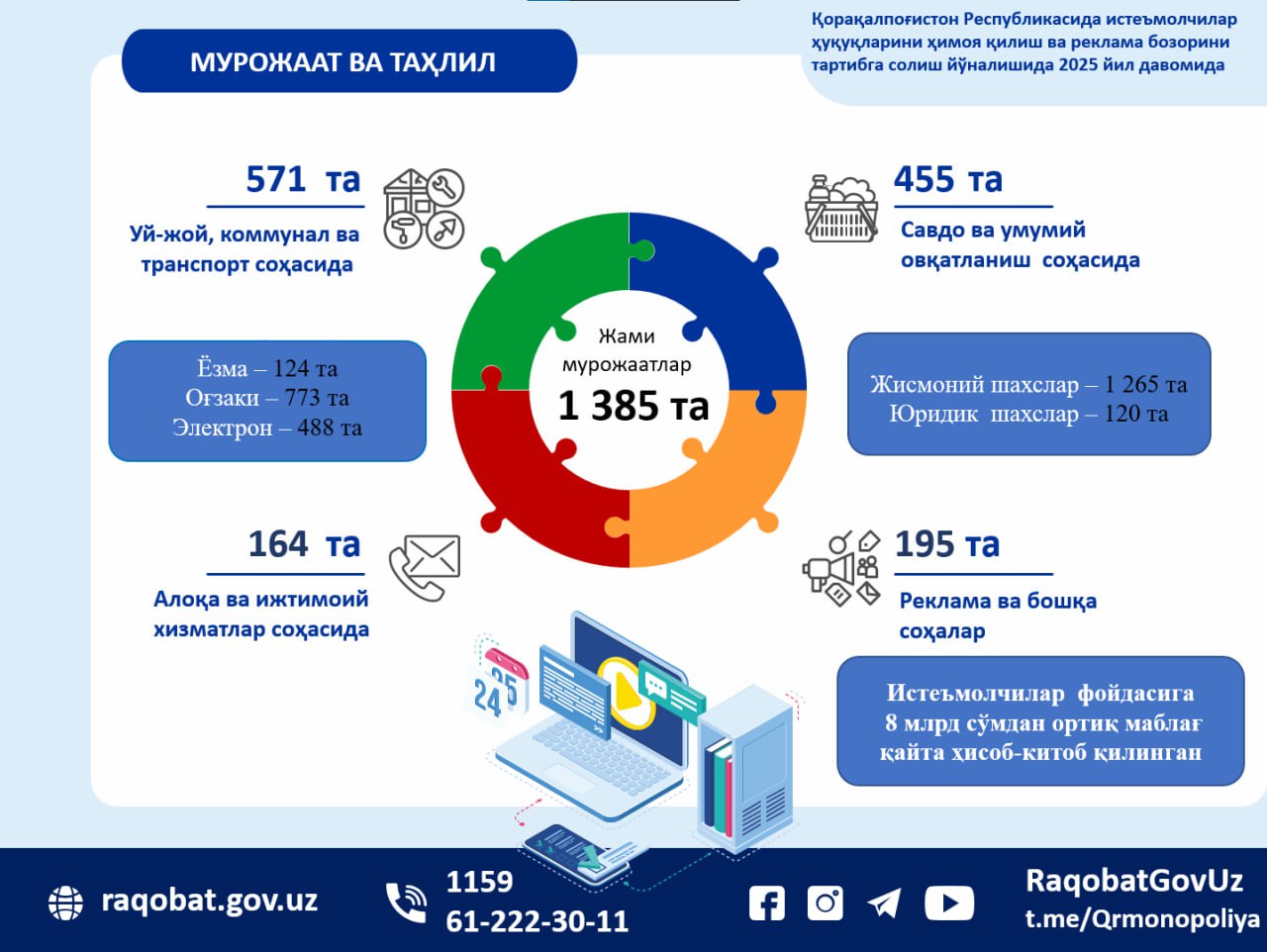 Қорақалпоғистон Республикаси Рақобатни ривожлантириш ва истеъмолчилар ҳуқуқларини ҳимоя қилиш қўмитасига ўтган 2025 йил давомида истеъмолчилардан жами 1 385 та мурожаатлар келиб тушган.