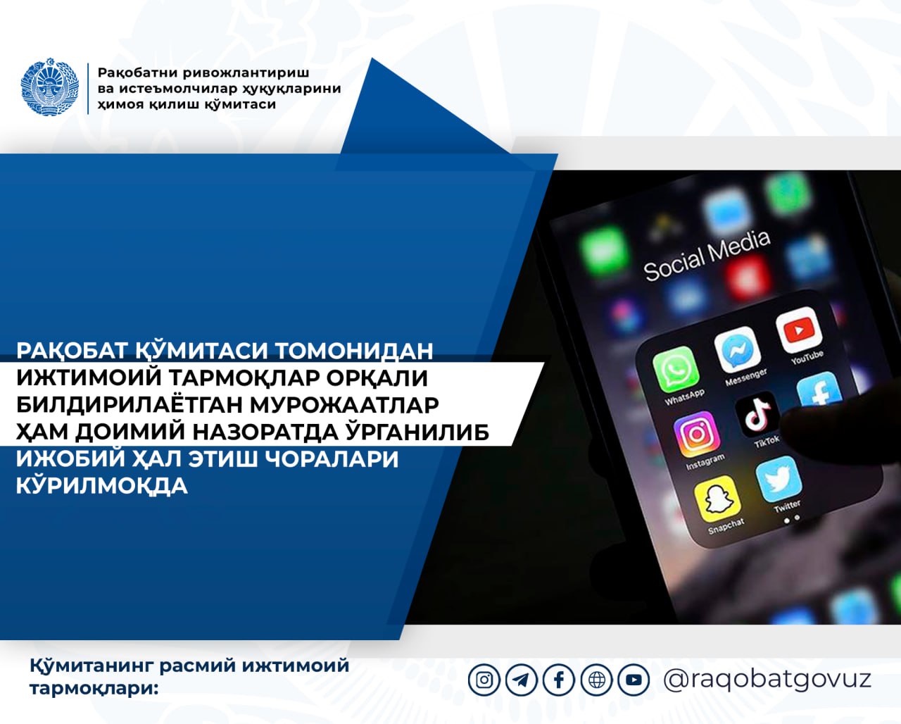 Рақобат қўмитаси томонидан ижтимоий тармоқлар орқали билдирилаётган мурожаатлар ҳам доимий назоратда ўрганилиб ижобий ҳал этиш чоралари кўрилмоқда