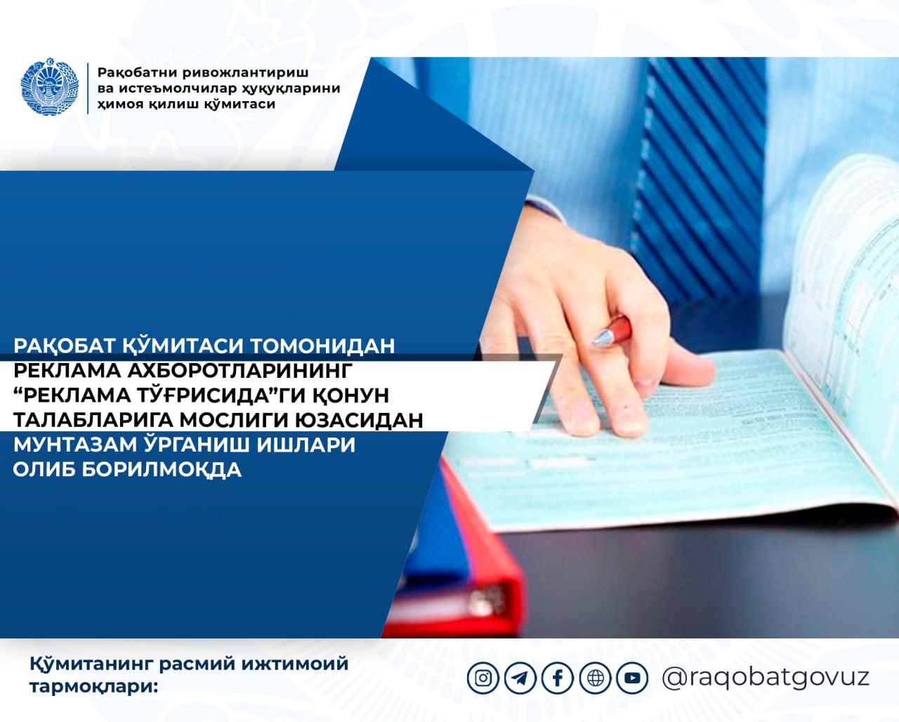 Рақобат қўмитаси томонидан реклама ахборотларининг “Реклама тўғрисида”ги Қонун талабларига мослиги юзасидан мунтазам ўрганиш ишлари олиб борилмоқда.