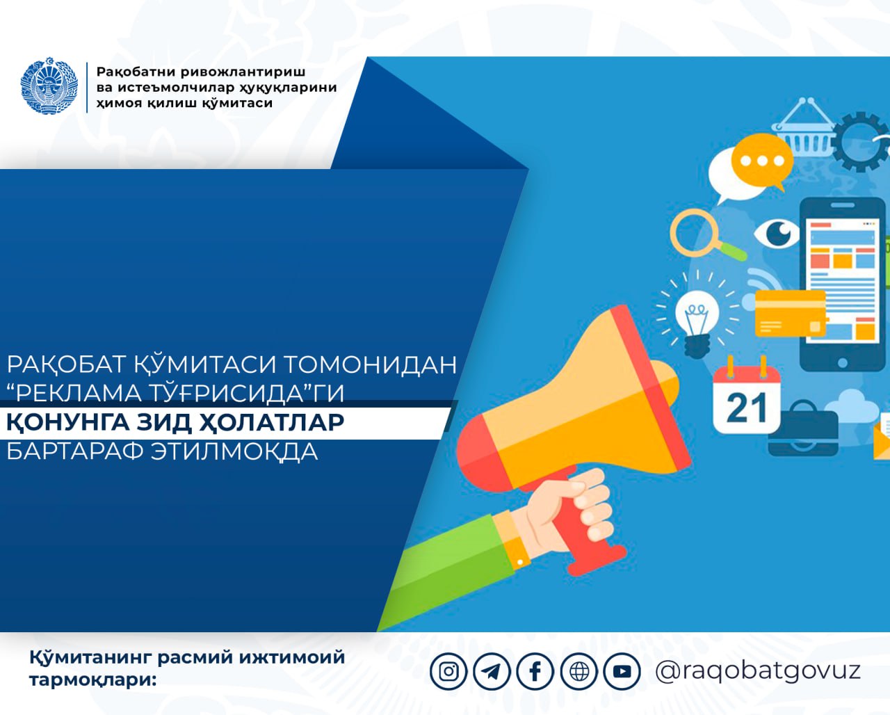 Рақобат қўмитаси “Реклама тўғрисида”ги Қонунга мувофиқ, рекламанинг айланиши соҳасидаги қонунбузилиш ҳолатларини назорат қилувчи ваколатли давлат органи ҳисобланди. Қўмита томонидан ўтган 2024 йилда бу борада тизимли ўрганиш ва мониторинг ишлари олиб борилди.