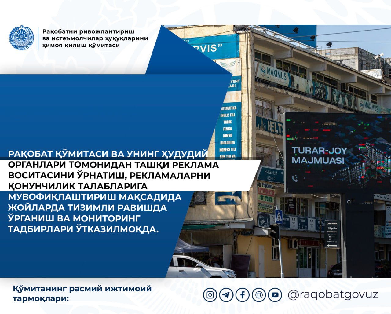 Рақобат қўмитаси ва унинг ҳудудий органлари томонидан ташқи реклама воситасини ўрнатиш, рекламаларни қонунчилик талабларига мувофиқлаштириш мақсадида жойларда тизимли равишда ўрганиш ва мониторинг тадбирлари ўтказилмоқда.