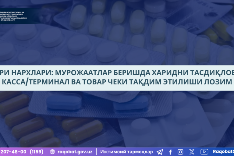 Авг292024 Дори нархлари: Мурожаатлар беришда харидни тасдиқловчи касса/терминал ва товар чеки тақдим этилиши лозим 29.08.2024