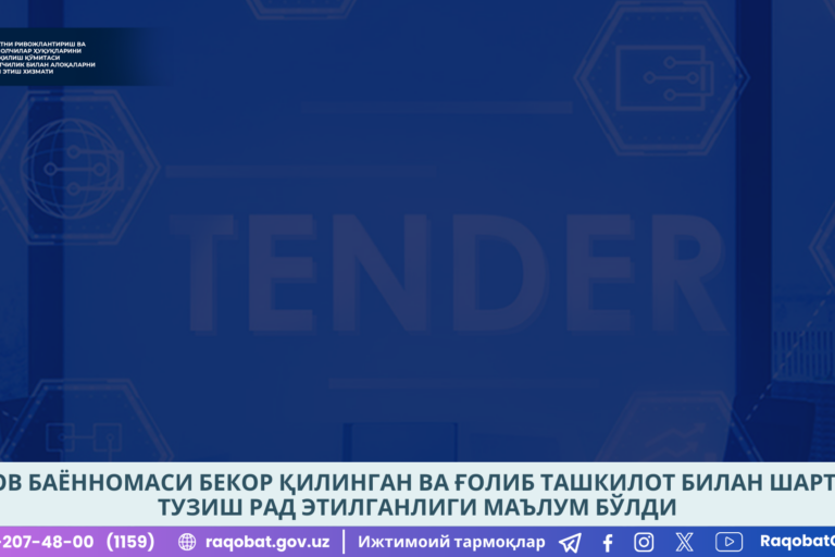 Сен162024 Танлов баённомаси бекор қилинган ва ғолиб ташкилот билан шартнома тузиш рад этилганлиги маълум бўлди 16.09.2024