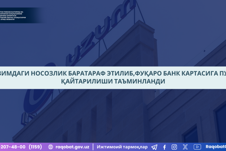 Окт42024 ТИЗИМДАГИ НОСОЗЛИК БАРАТАРАФ ЭТИЛИБ,ФУҚАРО БАНК КАРТАСИГА ПУЛИ ҚАЙТАРИЛИШИ ТАЪМИНЛАНДИ 04.10.2024