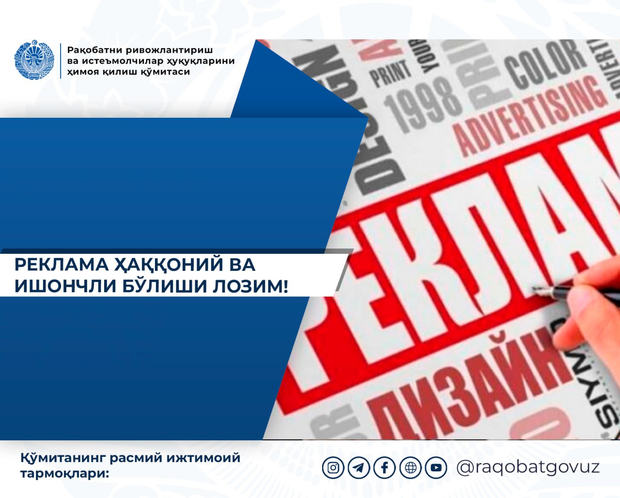 Турли хил манбалар ва ижтимоий тармоқларда шубҳали рекламаларга дуч келсангиз, берилаётган маълумотларнинг ишончлилигини текшириб олиш учун Рақобат қўмитасига мурожаат қилинг.