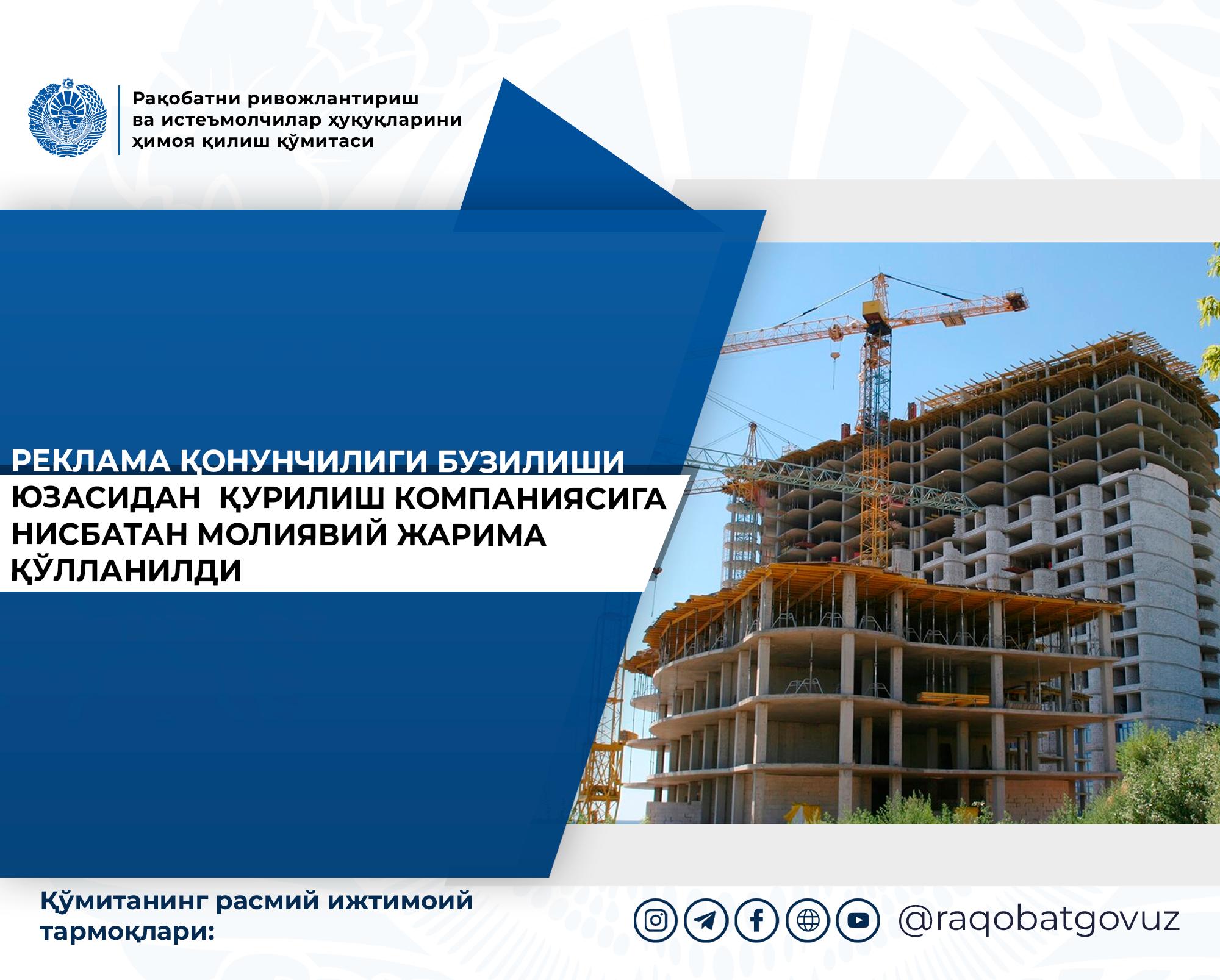 РЕКЛАМА ҚОНУНЧИЛИГИ БУЗИЛИШИ ЮЗАСИДАН ҚУРИЛИШ КОМПАНИЯСИГА НИСБАТАН МОЛИЯВИЙ ЖАРИМА ҚЎЛЛАНИЛДИ