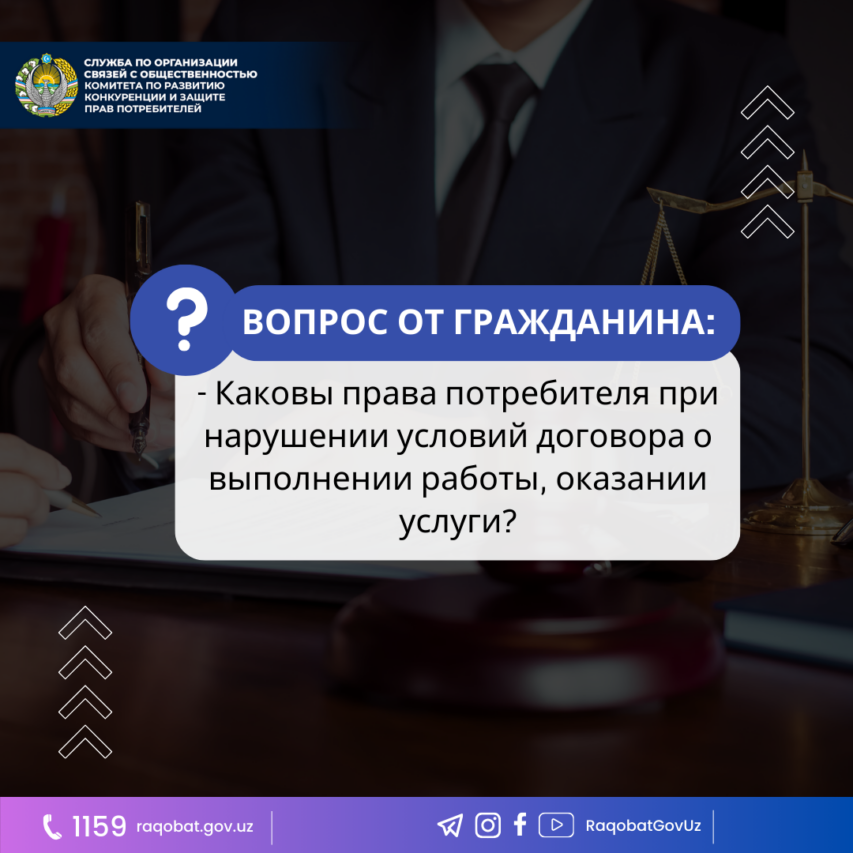 ВОПРОС ОТ ГРАЖДАНИНА: -Каковы права потребителя при нарушении условий договора о выполнении работы, оказании услуги? ОТВЕТ: Исполнитель обязан выполнить работу (оказать услугу) в срок, объеме и качестве, установленные правилами выполнения отдельных видов работ (оказания отдельных видов услуг) или договором. Срок исполнения работы (оказания услуги) может определяться датой (периодом времени), к которой работа (услуга) должна быть…