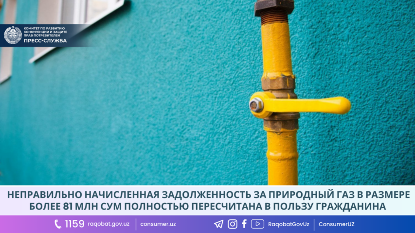 Неправильно начисленная задолженность за природный газ в размере более 81 млн сум полностью пересчитана в пользу гражданина