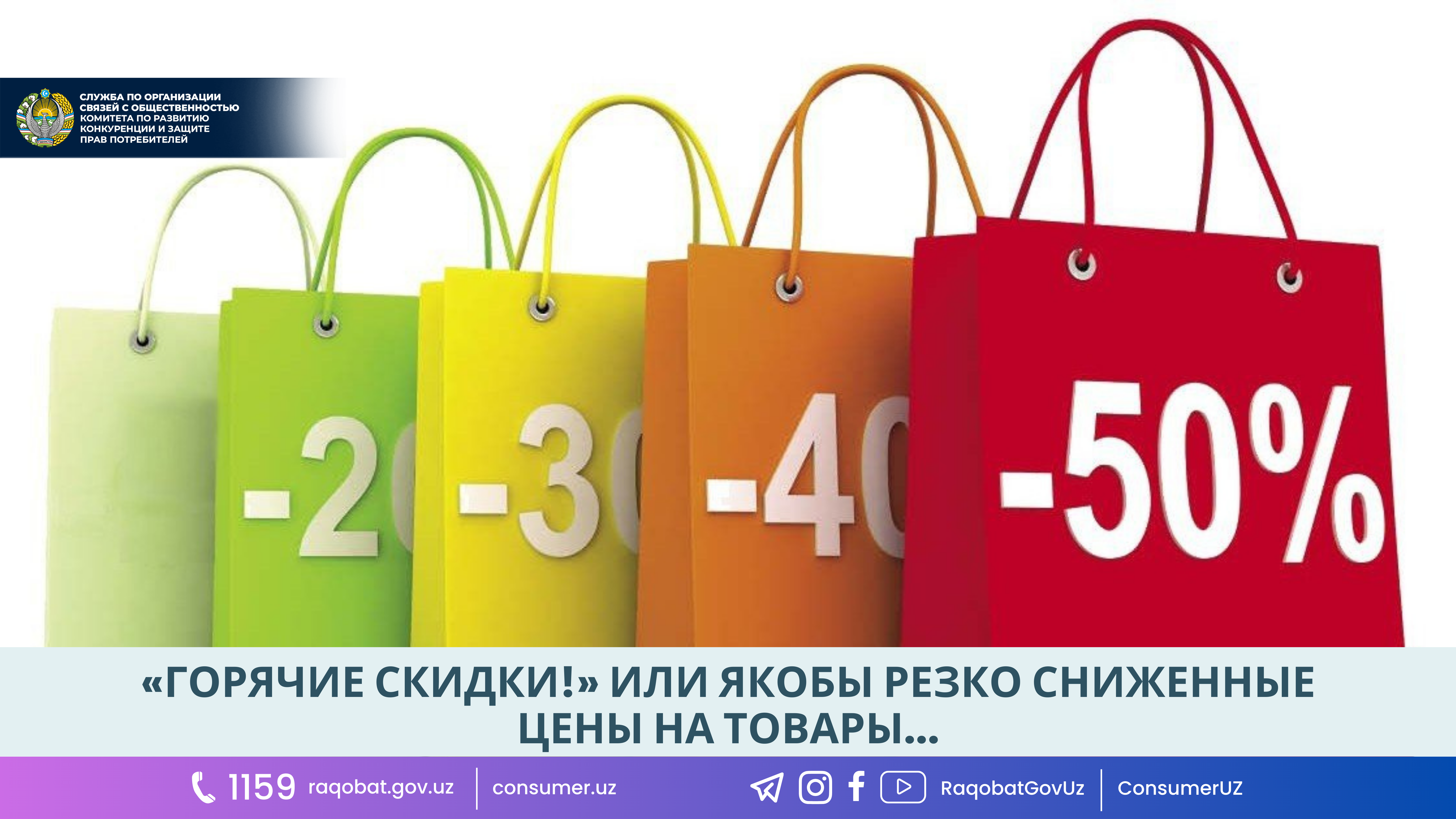 Уважаемые потребители, просим вас обращаться в колл-центр Комитета (1159) в случае возникновения препятствий и проблем при приобретении товаров со скидкой или в случаях распространения недостоверной и ненадлежащей рекламы.