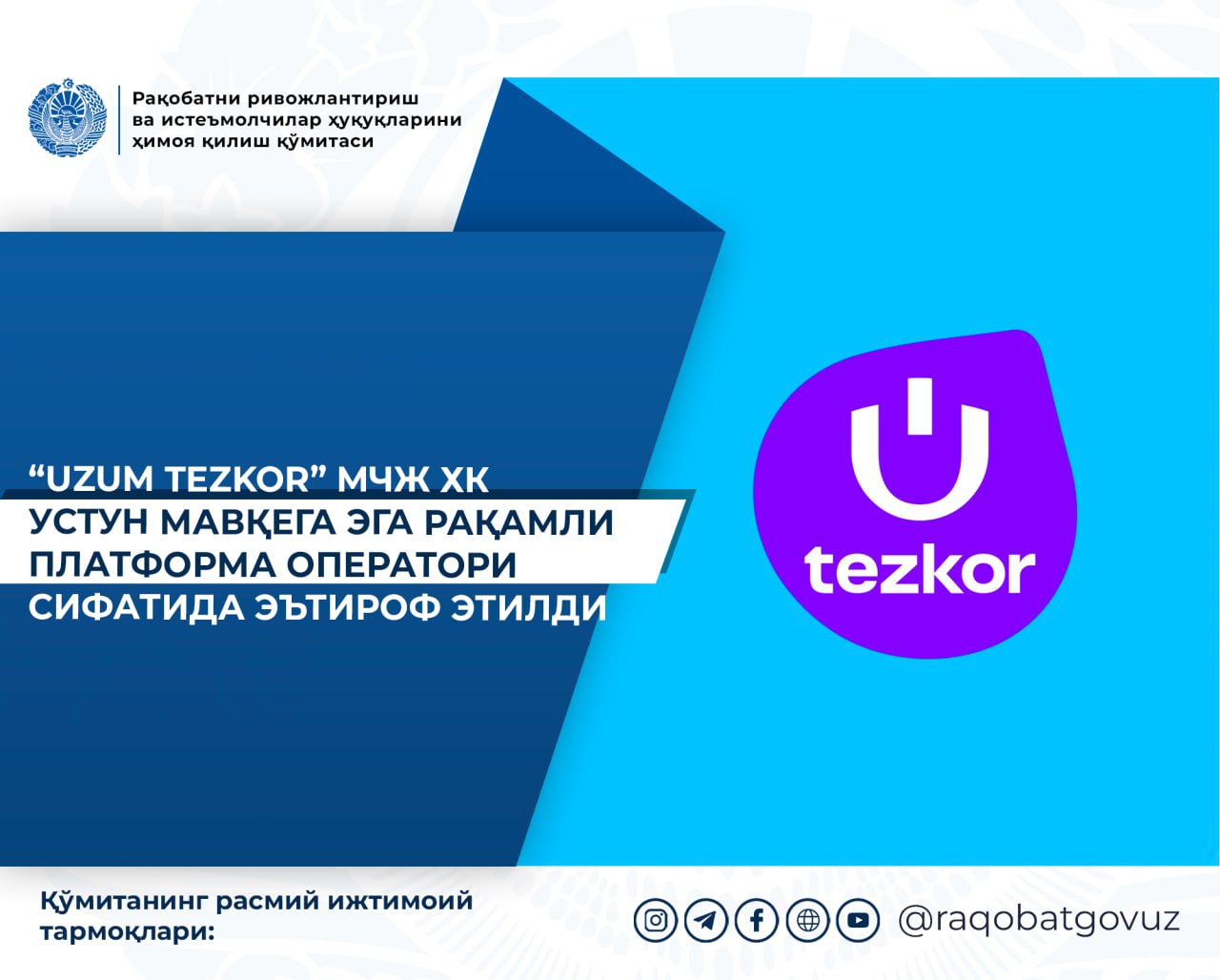 Согласно соответствующему приказу Комитета по конкуренции, ИП ООО «Uzum Tezkor» признано оператором цифровой платформы, занимающим доминирующее положение на рынке услуг агрегаторов по заказу и доставке готовой еды и других потребительских товаров.