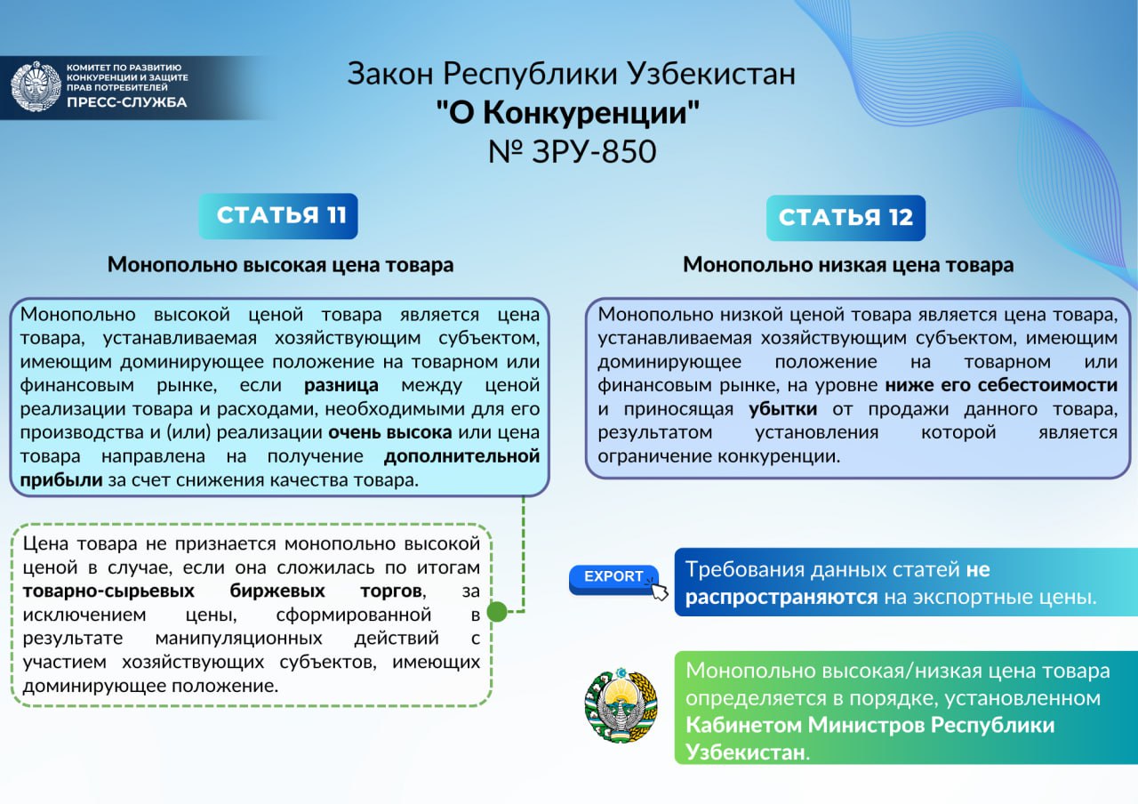 Июл182023Что означает монопольно высокая и монопольно низкая цена товара? Поделиться в соц.сетях Поделиться в FacebookПоделиться в Facebook ТвитнутьПоделиться в Twitter Pin itПоделиться в Pinterest Поделиться в WhatsAppПоделиться в WhatsApp Поделиться в LinkedInПоделиться в LinkedIn Другие новостиВыступление Президента Республики Узбекистан Шавката Мирзиёева на церемонии открытия 43-й сессии Генеральной конференции ЮНЕСКО30.10.2025Скоро в самаркандском Конгресс-центре начнется церемония открытия 43-й сессии Генеральной конференции ЮНЕСКО30.10.202522 октября 2025 года в рамках проекта «Повышение институционального потенциала»…24.10.2025В городе Брест (Республика Беларусь), в рамках 59-го заседания Межгосударственного совета по антимонопольной политике (МСАП)…24.10.2025С 20 по 23 октября 2025 года в городе Брест (Республика Беларусь) состоялись 59-е заседание…22.10.2025В Беларуси прошла встреча по укреплению сотрудничества в сфере защиты прав потребителей21.10.2025