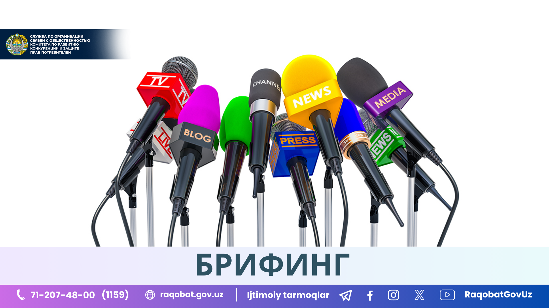 Информацию на брифинге предоставит Отабек Усмонов советник председателя Комитета по развитию конкуренции и защите прав потребителей (брифинг будет транслироваться онлайн на телеканалах «O‘zbekiston 24», «UzReport TV» и YouTube).