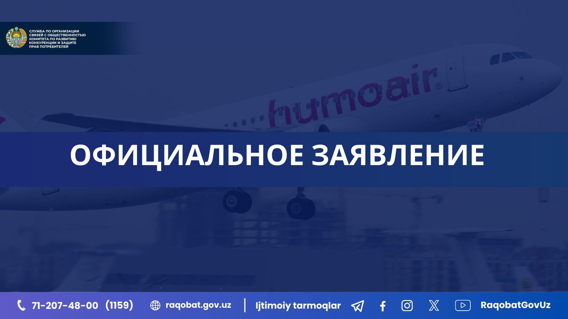 В результате проведенных изучений ситуации Комитетом по конкуренции, выяснилось, что в 2024 году со стороны ООО «HUMO AIR» было отменено 284 рейса и пассажиры, купившие авиабилеты, не смогли вернуть свои деньги. Установлено, что авиакомпания нарушила требования статей 19 и 21 Закона Республики Узбекистан «О защите прав потребителей».