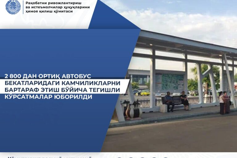 Июн182025 Соответствующие поручения по устранению недостатков на более чем 2 800 автобусных остановках, изученных Комитетом по конкуренции, направлены в Министерство транспорта, Совет Министров Каракалпакстана и областные хокимияты.