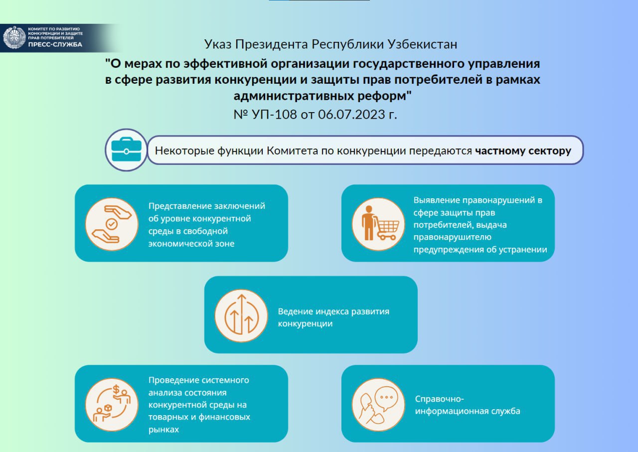 Указ Президента РУз №УП-108 «О мерах по эффективной организации государственного управления в сфере развития конкуренции и защиты прав потребителей в рамках административных реформ».