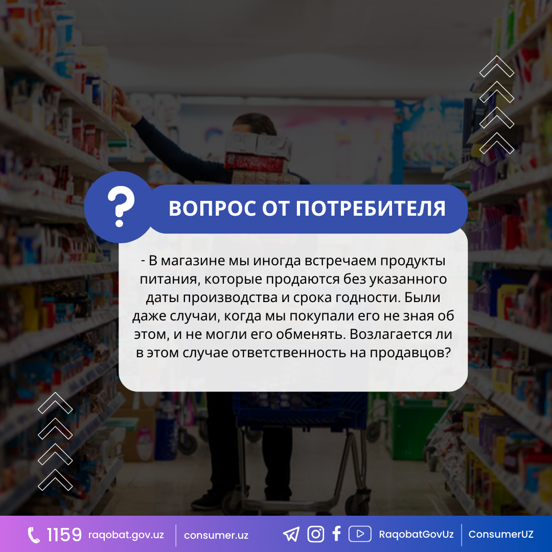 — В магазине мы иногда встречаем продукты питания, которые продаются без указанного даты производства и срока годности. Были даже случаи, когда мы покупали его не зная об этом, и не могли его обменять. Возлагается ли в этом случае ответственность на продавцов?
