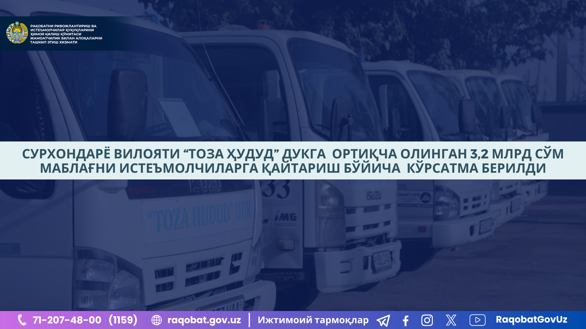 Шунингдек, 3,2 млрд сўмдан ортиқ маблағни истеъмолчилар фойдасига қайта ҳисоб-китоб қилиниши бўйича бажарилиши мажбурий бўлган кўрсатма берилди.