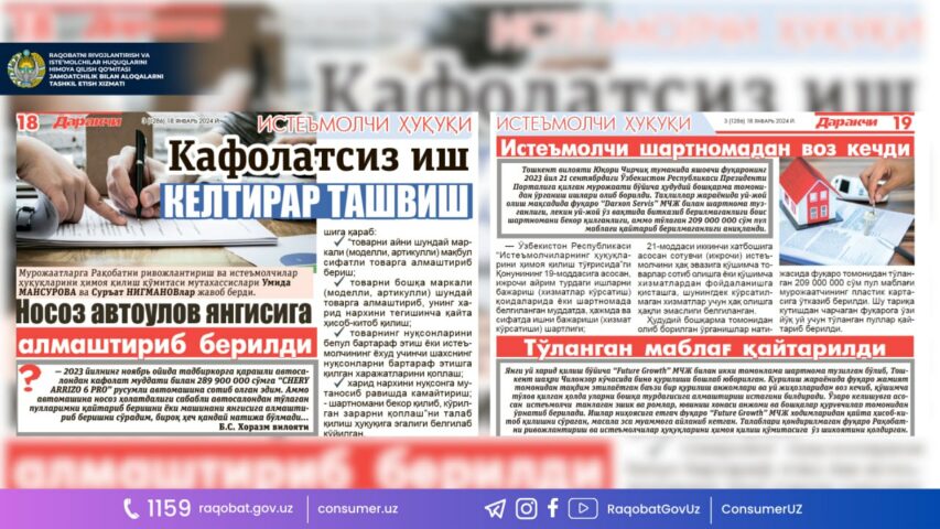 Murojaat va natija KOMMUNAL SOHADAGI MUAMMOLAR IJOBIY HAL ETILDI Farg‘ona viloyati Raqobatni rivojlantirish va iste’molchilar huquqlarini himoya qilish qo‘mitasi hamda uning hududiy boshqarmalariga kommunal sohalar – elektr energiyasi, ichimlik suvi, gaz ta’minoti va issiqlik manbai borasida iste’molchilardan tushgan murojaatlar qisqa muddatda o‘z yechimini topmoqda. Jumladan, qo‘mitaning Farg‘ona hududiy boshqarmasiga Bag‘dod tumanida yashovchi fuqaro S.N. elektr…