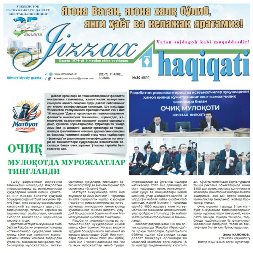 #Ochiq_muloqot_tafsilotlari Raqobat qo‘mitasi tomonidan Jizzax viloyatida tashkil etilgan ochiq uchrashuv aholi hamda tadbirkorlarni qiynayotgan masalalarni aniqlash va ularni hal etishga qaratildi. Muloqot davomida kelib tushgan murojaatlar atroflicha ko‘rib chiqilib, mavjud muammolarni bartaraf etish bo‘yicha aniq choralar rejasi ishlab chiqildi. Tafsilotlar «Jizzax haqiqati» (https://t.me/jizzaxnews_press/17505)ва «Djizakskaya pravda» (https://t.me/jizzaxnews_press/17506) gazetalari sahifalarida o‘zbek va rus tillarida. 11.04.2026-yil.№30 va16-sonlari.