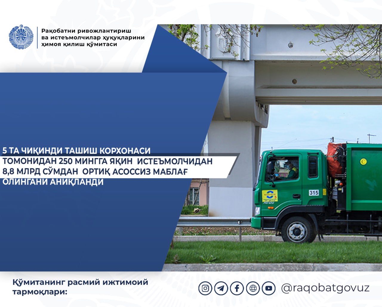 5 ta chiqindi tashish korxonasi tomonidan 250 mingga yaqin iste’molchidan 8,8 mlrd so‘mdan ortiq asossiz mablag‘ olingani aniqlandi
