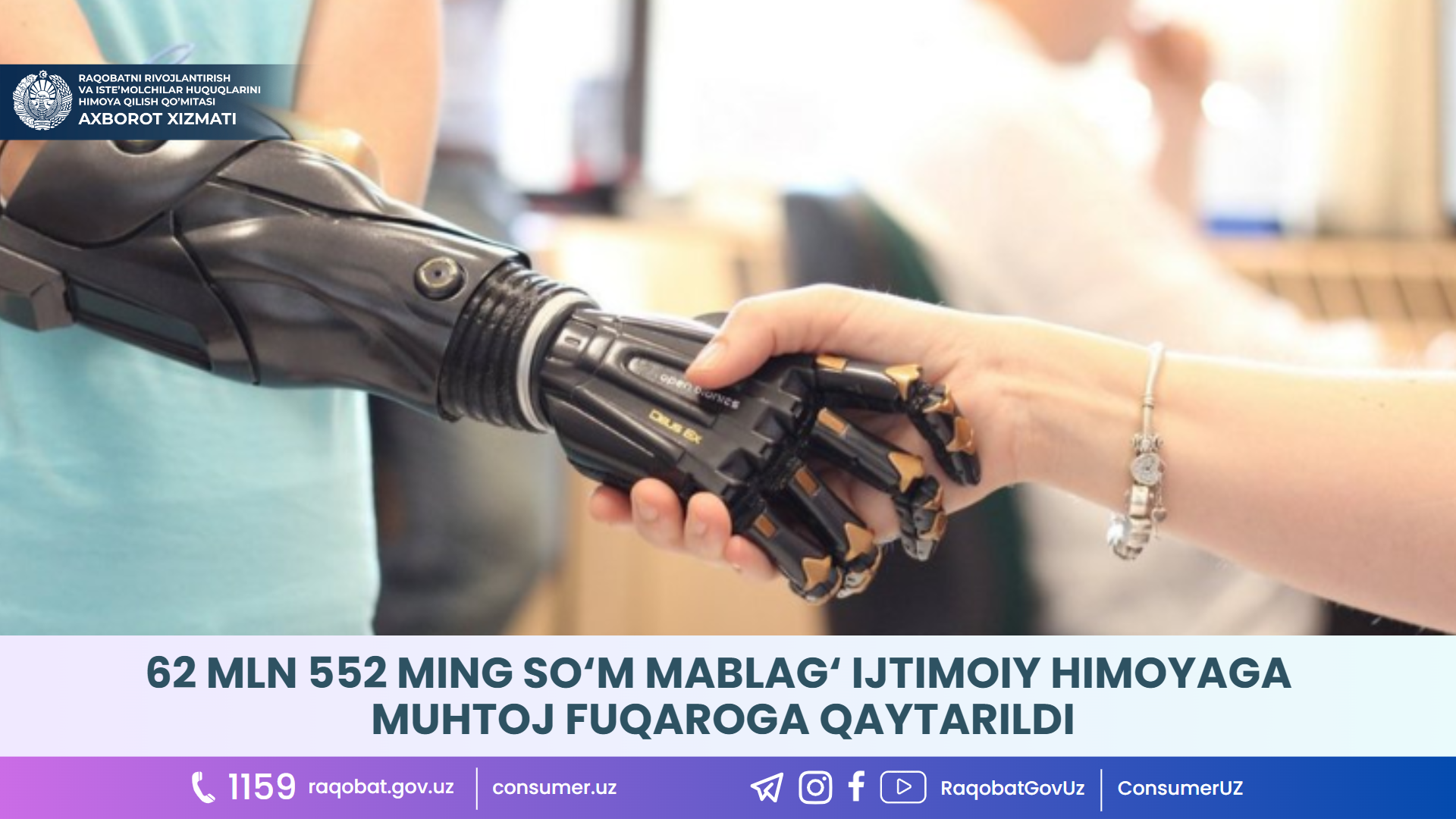 O‘rganishlarda haqiqatan ham murojaat oylar davomida hal etilmay kelinayotgani ma’lum bo‘ldi. Natijada iste’molchiga protez uchun to‘langan 62 mln 552 ming so‘m mablag‘ “MINGBAEV’S ACADEMY OF ROBOTICS” OK tomonidan qaytarib berilishiga erishildi.