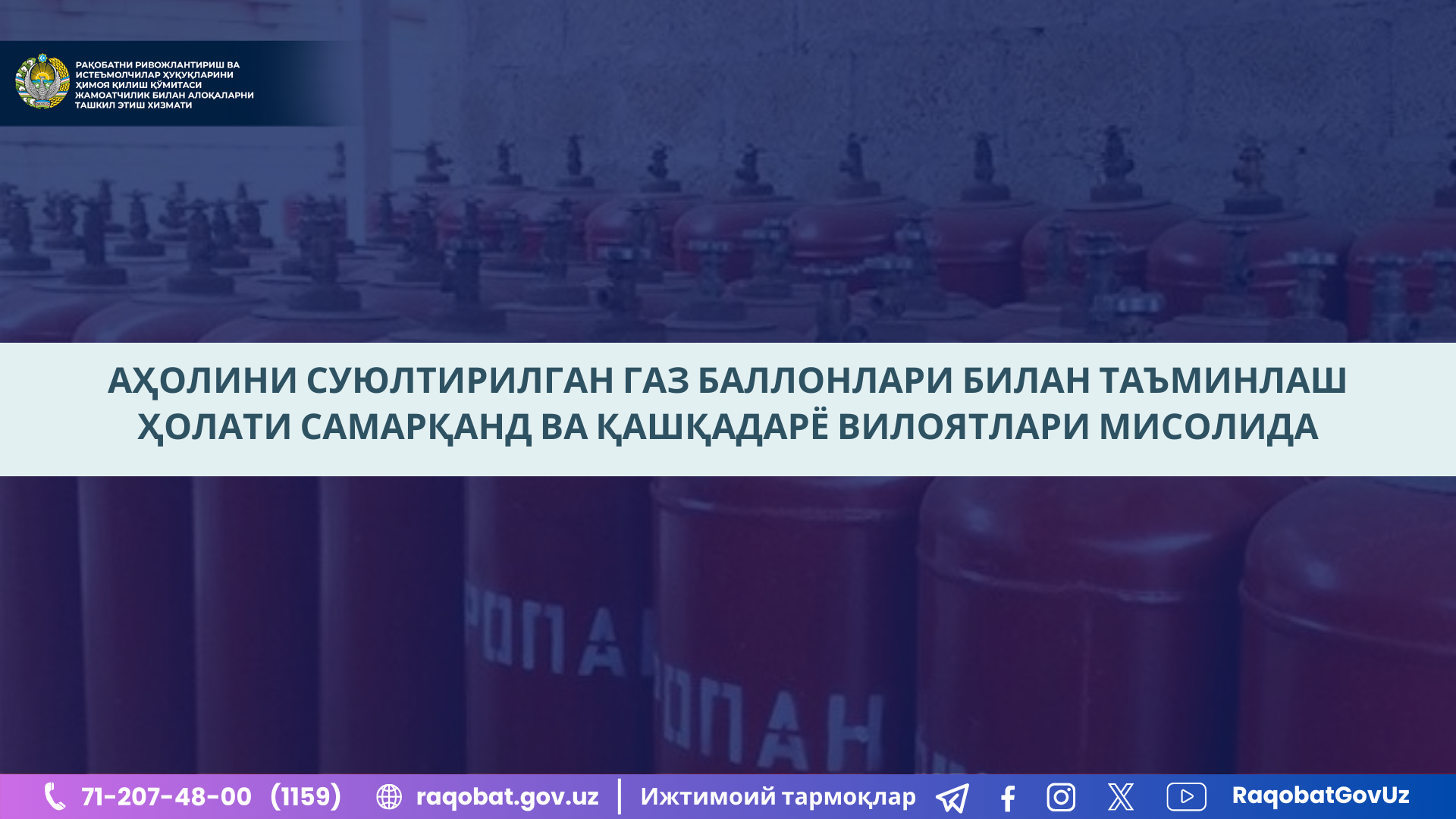 Raqobatni rivojlantirish va iste’molchilar huquqlarini himoya qilish qo‘mitasi va uning hududiy boshqarmalari tomonidan gaz ballonlarida suyultirilgan gaz yetkazib berish xizmati yuzasidan o‘rganish va tahlil ishlari o‘tkazildi. Samarqand viloyati Raqobat qo‘mitasining Samarqand viloyati hududiy boshqarmasi tomonidan “Hududgaz Samarqand” gaz ta’minoti filialining iste’molchilarga gaz ballonlarida suyultirilgan gaz yetkazib berish xizmati yuzasidan o‘rganish ishlari o‘tkazildi. O‘tkazilgan o‘rganish natijalariga ko‘ra, gaz ballonlarining har biri 20 kg.dan suyultirilgan gaz bilan to‘ldirilgan holda iste’molchilarga yetkazib berilgan bo‘lsa-da, iste’molchilardan gaz ballonlarini qaytarib olishda ballonlarda qolgan suyultirilgan og‘ir gaz qoldiqlari inobatga olinmaganligi natijasida “Iste’molchilarning huquqlarini himoya qilish to‘g‘risida”gi Qonunning 21-moddasi 2-xatboshi talablariga amal qilinmaganligi holatlari qayd etildi. Yuqoridagilarga ko‘ra, “Hududgaz Samarqand” gaz ta’minoti filiali tomonidan o‘tgan davr mobaynida jami 218,437 tonna iste’mol qilinmagan suyultirilgan gaz uchun iste’molchilardan jami 250 mln so‘mga yaqin asossiz daromad olinganlik holati aniqlanib, hududiy boshqarma maxsus komissiyasi tomonidan asossiz olingan 250 mln so‘mga yaqin daromadni iste’molchilarga qaytarish va mazkur qonun buzilish holatlari kelgusida takrorlanmaslik to‘g‘risida ko‘rsatma berildi. Qashqadaryo viloyati Qashqadaryo viloyatida “Hududgaz Qashqadaryo” AJ tomonidan 2024-yil holatiga ko‘ra 586 568 ta xonadon jami 772 060 dona gaz ballonlari bilan ta’minlangan bo‘lsada, ayrim muammolar hali hanuzgacha bartaraf etilmaganligini guvohi bo‘lmoqdamiz. Raqobat qo‘mitasining Qashqadaryo viloyati hududiy boshqarmasiga joriy yil davomida 46 ta, iyul-avgust oylarida esa 15 ga yaqin suyultirilgan gaz ballonlarini yetkazib berish hamda gaz ballon bilan ta’minlash to‘g‘risida murojaatlar kelib tushgan. Yuqoridagi murojaatlarda keltirilgan vajlar bo‘yicha hududiy boshqarma «Hududgaz» AJ bilan hamkorlikda o‘rganish va tahlil ishlari olib borildi. Natijada, hududiy boshqarmaga kelib tushgan 46 ta murojaatning barchasi ijobiy hal etildi, aholiga suyultirilgan gaz ballonidan foydalanish qoidalari va talablari bo‘yicha ogohlantirish berildi. Yuqoridagilardan kelib chiqib, Qo‘mita tomonidan respublikamizning boshqa hududlarida xam bu boradagi ishlar tizimli ravishda amalga oshirilmoqda.