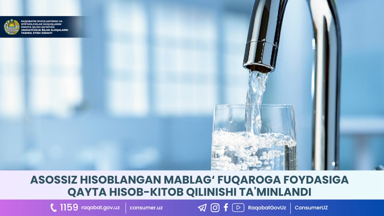 O‘rganish natijalariga ko‘ra, Paxtakor tuman suv ta’minoti korxonasi tomonidan fuqaroga hisoblangan asossiz 14 535 900 soʻm qarzdorlik fuqaro foydasiga qayta hisob kitob qilinishi ta’minlandi.