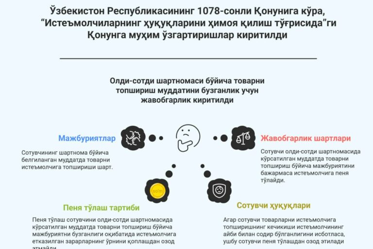 Avg142025 O‘zbekiston Respublikasining 1078-sonli Qonuniga ko‘ra, “Iste’molchilarning huquqlarini himoya qilish to‘g‘risida”gi Qonunga ayrim o‘zgartirishlar kiritildi.