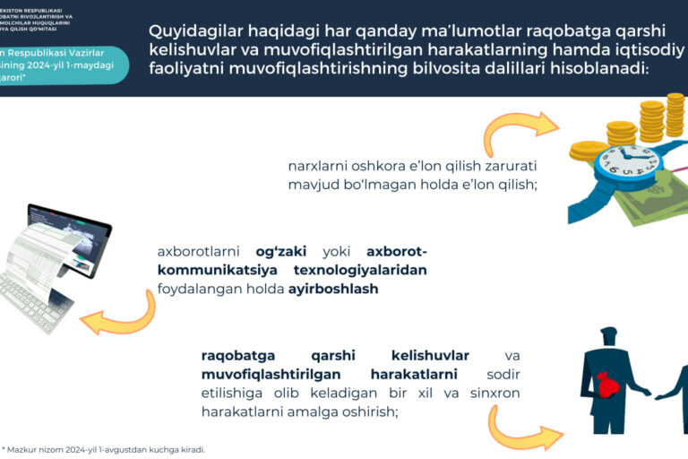 May212024 O‘zbekiston Respublikasi Vazirlar Mahkamasining 2024-yil 1-maydagi 256-sonli qarori bilan Raqobatga qarshi kelishuvlarni va muvofiqlashtirilgan harakatlarni aniqlash tartibi to‘g‘risida nizom tasdiqlandi.
