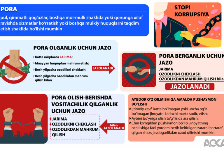 May32024 Pora – pul, qimmatli qog‘ozlar, boshqa mol-mulk shaklida yoki qonunga xilof ravishda xizmatlar ko‘rsatish yoki boshqa mulkiy huquqlarni taqdim etish shaklida bo‘lishi mumkin