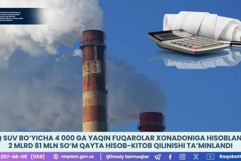 Apr12024 ISSIQ SUV BO‘YICHA 4 000 GA YAQIN FUQAROLAR XONADONIGA HISOBLANGAN 2 MLRD 81 MLN SO‘M PUL MABLAG‘LARI QAYTA HISOB-KITOB QILINISHI TA’MINLANDI